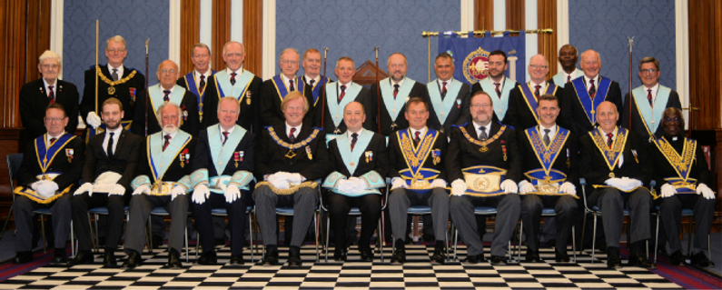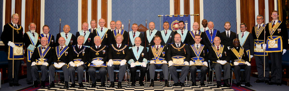 Our September 2016 meeting, the 128th Regular Meeting since the Consecration of our Lodge in October 1984, brought the dedication of a splendid banner featuring our striking symbolic emblem and listing the names of the seventeen founding Members. A gift to the Lodge from W Bro Mike Foxwell, one of those founding members, the dedication was carried out by Assistant Grand Master R W Bro Sir David Wooton.